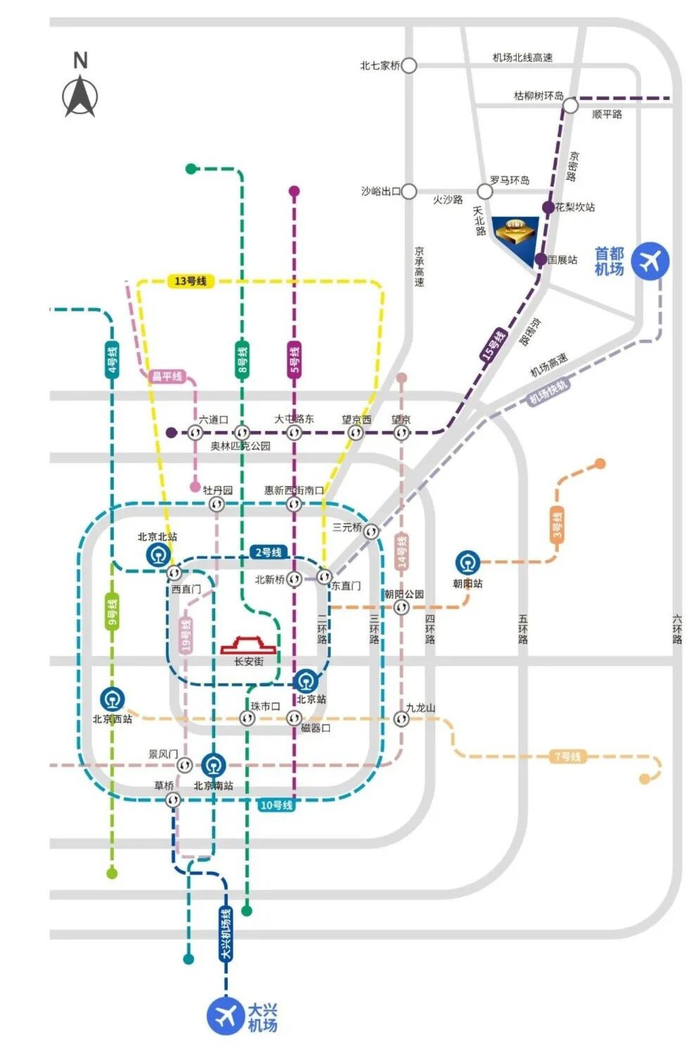 北京站乘坐地铁2号线到“东直门”站,换乘地铁13号线到“望京西”站,换乘地铁15号线到“国展”站下车即到。